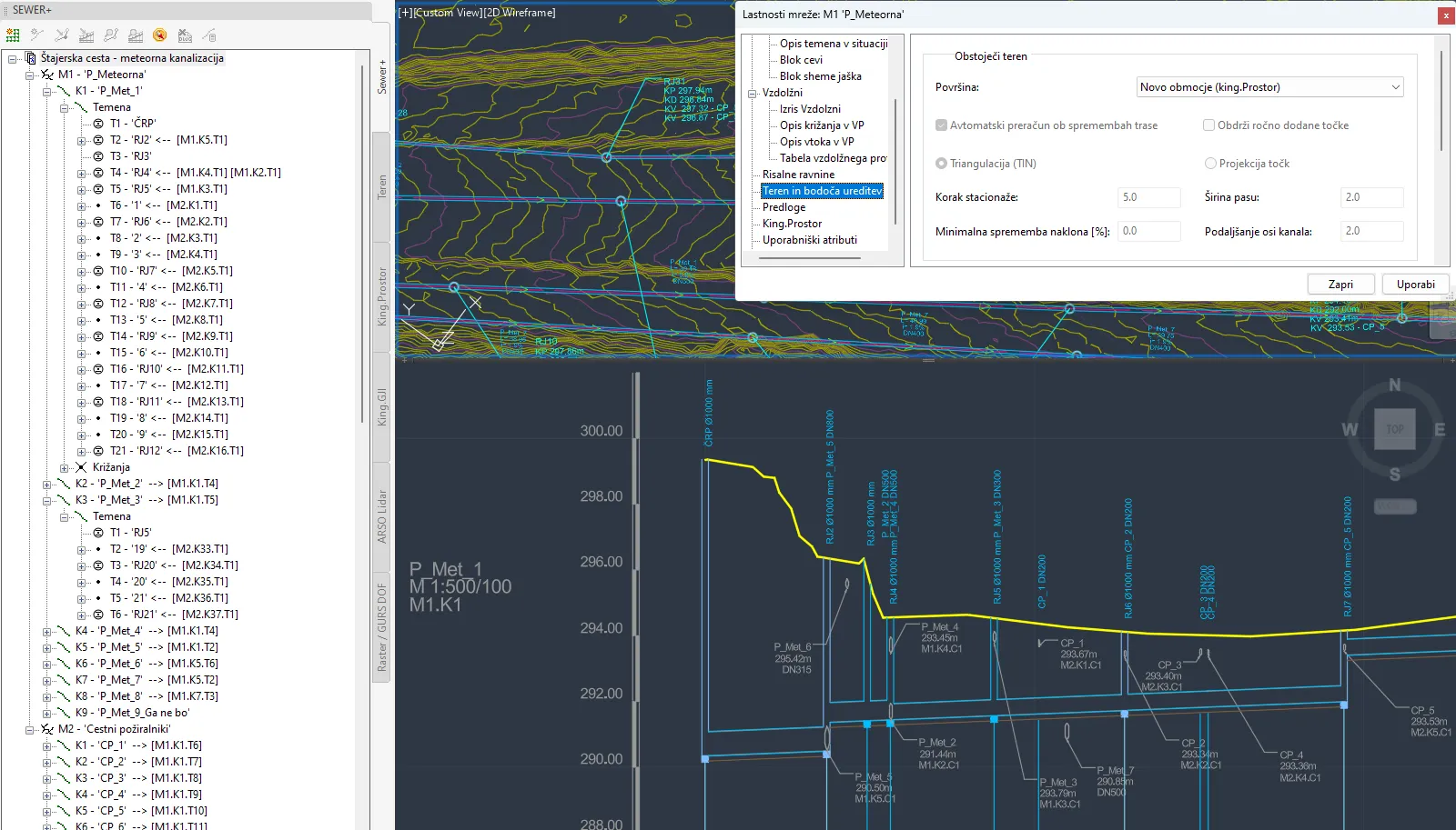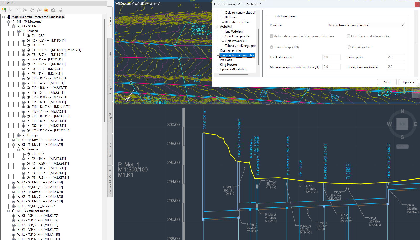 Na paleti Teren izberemo King.Prostor površino in že lahko prikažemo vzdolžni profil. S Sewer+ Pro lahko seveda uporabimo tudi GJI podatke in prikažemo križanja z obstoječo infrastrukturo.
