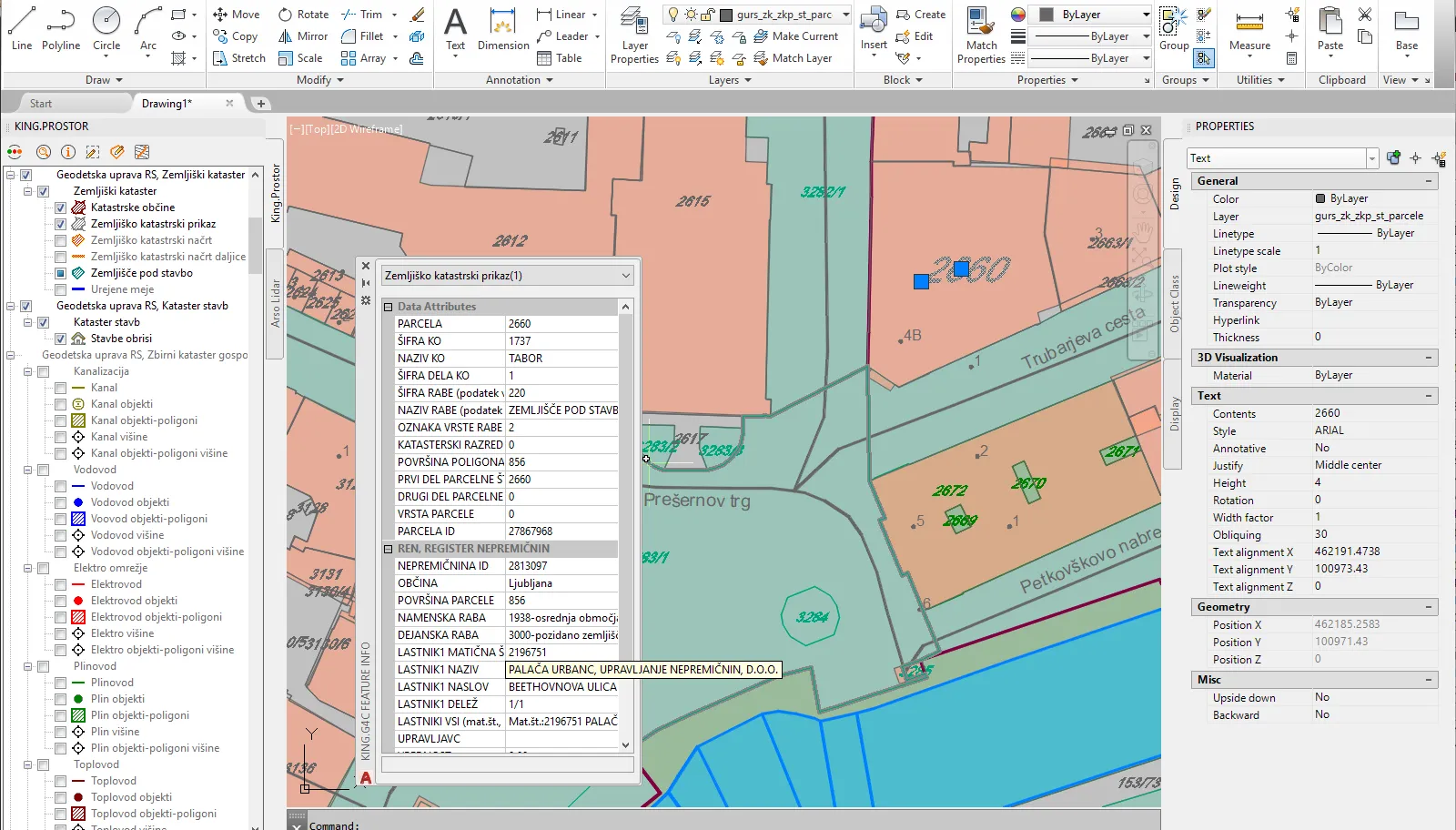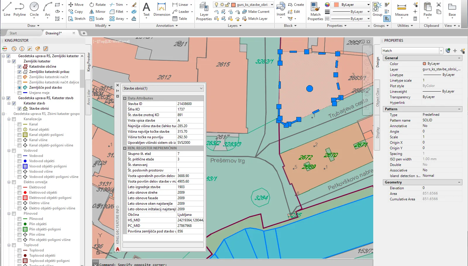 Poleg parcele lahko v King.Prostor izrišemo tudi zemljišče pod stavbo, preverimo usklajenost podatkov…