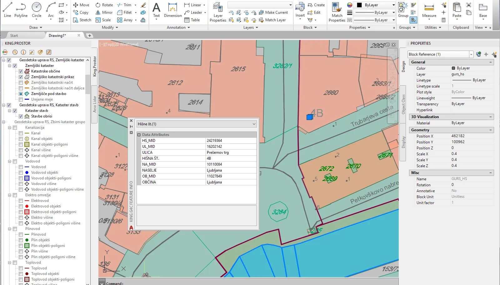 S King.Prostor lahko izrišemo tlorise stavb v D48 ali D96 koordinatnem sistemu ter pregledujemo atributivne podatke iz katastra stavb oz. povezane podatke o stavbah iz registra nepremičnin.