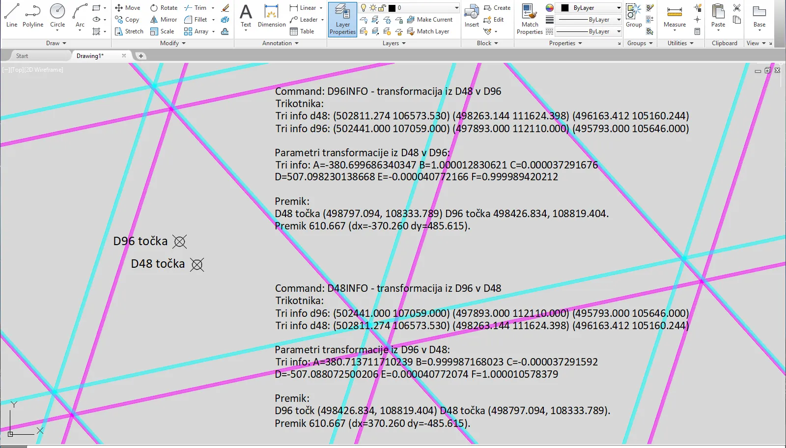 Torej, gumb v orodni vrstici “D96 Pretvori” pomeni, da se izvede transformacija iz D48 v D96. “D96 Info” omogoča, da izberemo točko v D48 in dobimo podatke o transformacijskih trikotnikih,