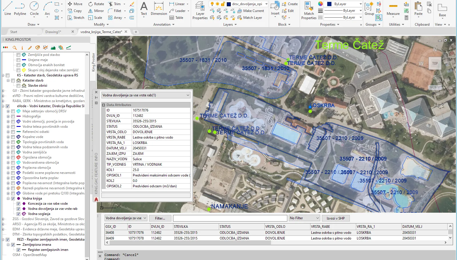 V Vodni knjigi se evidentirajo podeljene vodne pravice, ki vključujejo tudi evidentirane posebne rabe voda in izdana vodna soglasja. S King.Prostor lahko dobimo podatke iz Vodne knjige. Podatki se nahajajo v zavihku eVode in so razdeljeni v tri sloje. To so Koncesije za vse vrste rabe vode, Vodna dovoljenja za vse vrste rabe vode in Vodna soglasja. Vodno knjigo vodi Direkcija RS za vode.