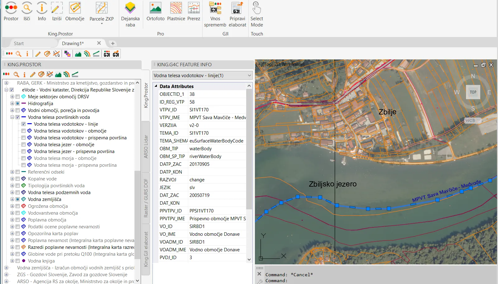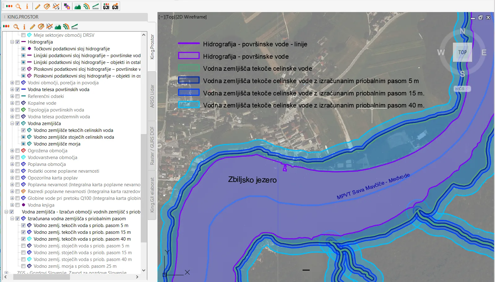 V King.Prostoru je omogočeno vseh 64 prostorskih slojev vodnega katastra. Dobimo podatke o hidrografiji, vodnih telesih površinskih in podzemnih voda, vodnih zemljiščih, vodovarstvenih območjih, ogroženih območjih, poplavnih območjih itd.